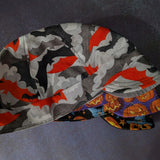 • Side view of the Bats Welding Cap featuring gray, black, red, and white bat pattern on cotton fabric — handcrafted by HD Welding Hats.